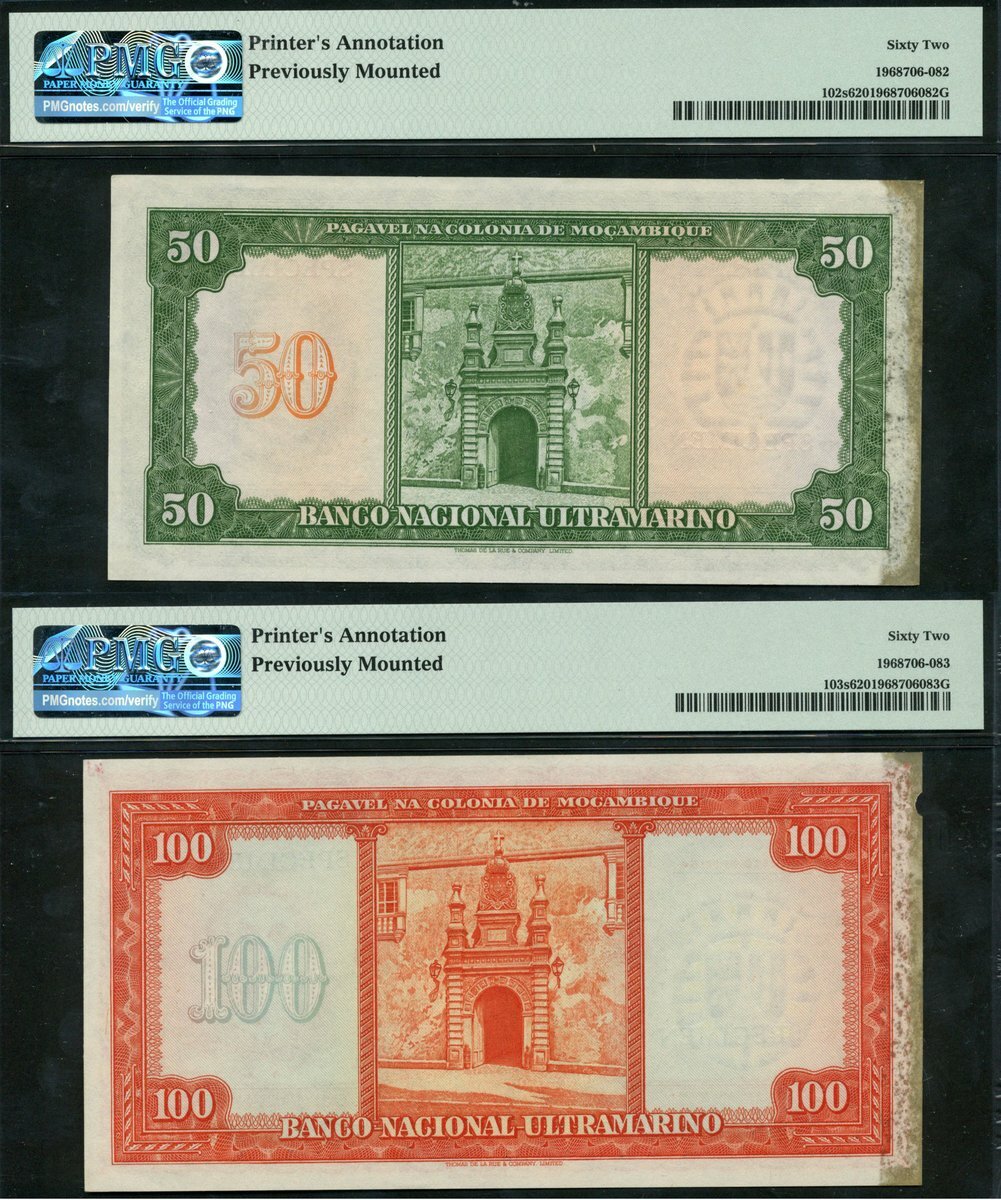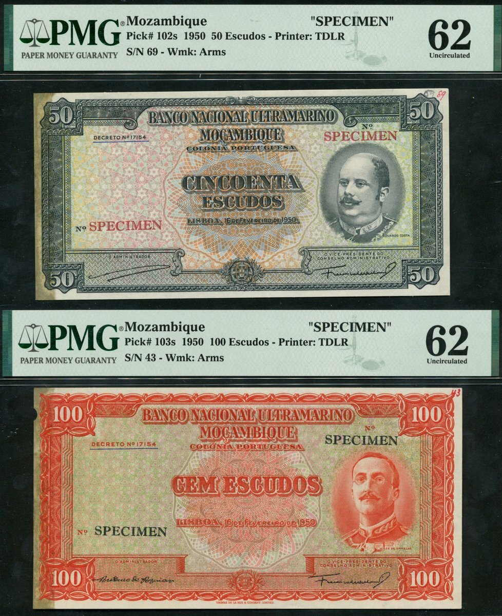 Banco Nacional Ultramarino, Mozambique, specimen 50 escudos, 1950, no serial numbers, black and multicoloured, Costa at right, reverse green, also specimen 100 escudos, 1950, no serial numbers, orange-red and green, Ornelas at right, reverse orange