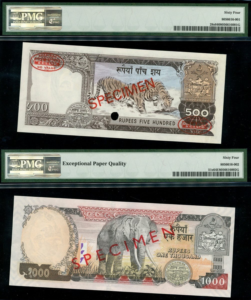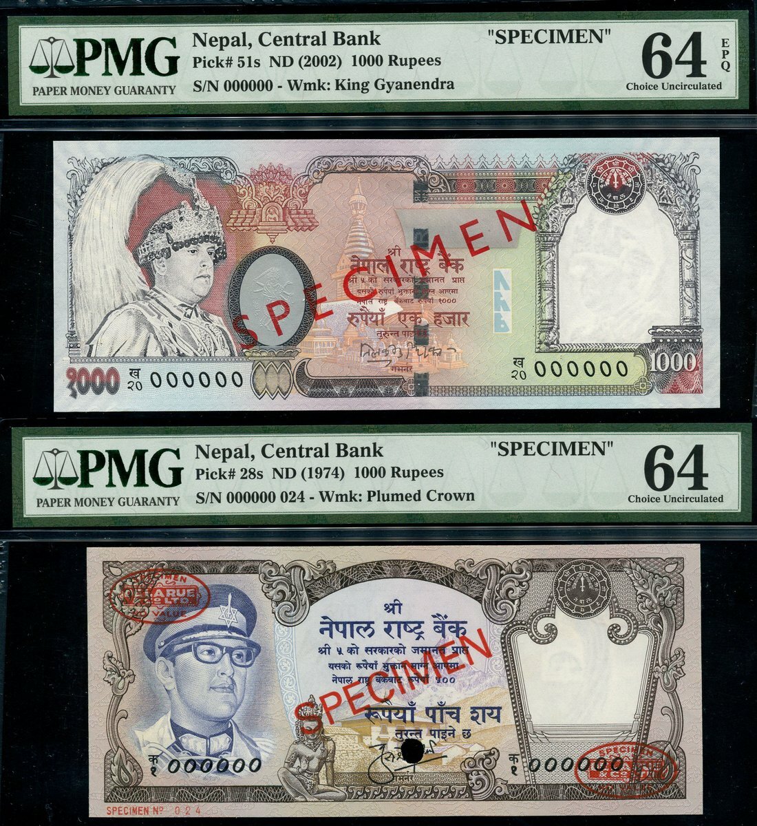 (x) Central Bank of Nepal, specimen 1000 rupees, ND (1974), zero serial numbers, blue and multicoloured, King Birendra Bir Bikram at left in military uniform at left, reverse blue, elephant at centre, also a specimen 1000 rupees, ND (2002), zero serial numbers, multicoloured, King Gyanendra at left