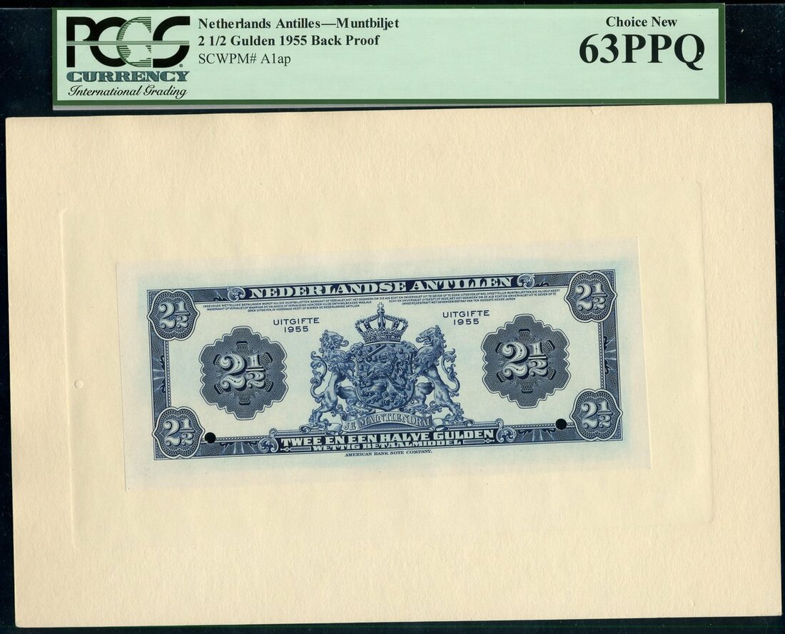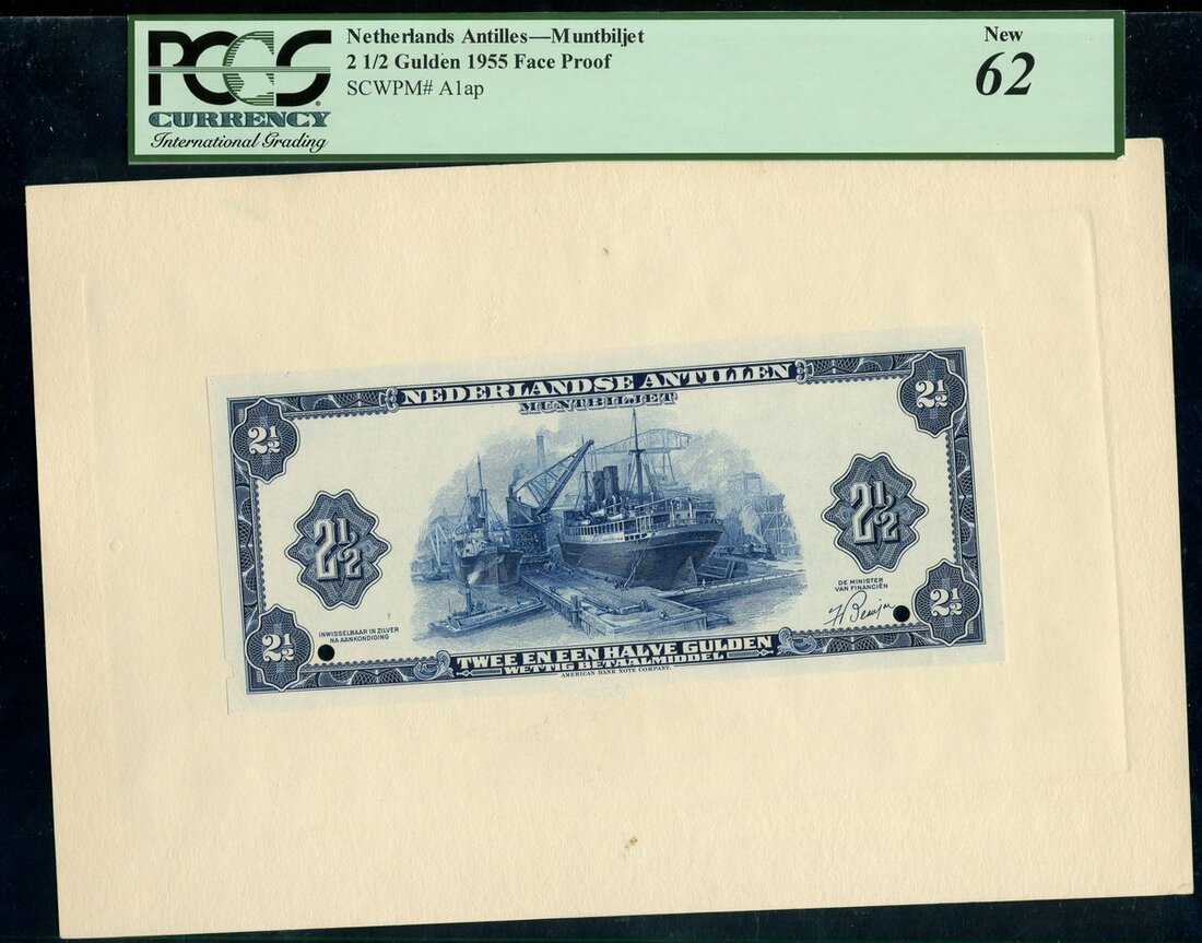 Netherlands Antilles, an obverse and reverse proof on card for a 2 1/2 gulden, 1955, blue and white, dockside scene at centre, value at left and right, reverse blue and white, arms at centre