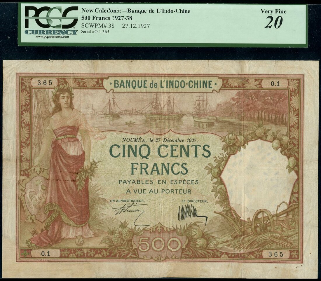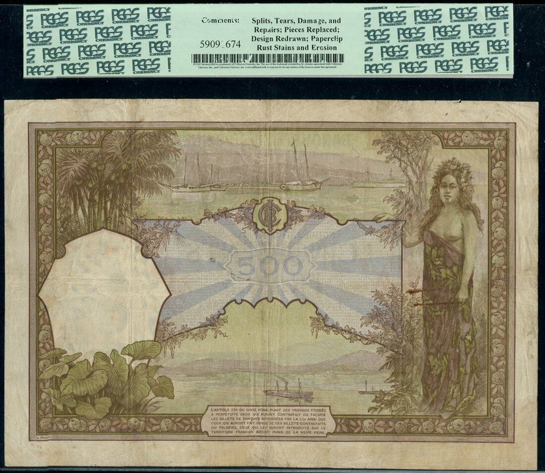 (x) Banque de L'Indo-Chine, New Caledonia, 500 francs, Noumea, 27 December 1927, serial number O.1 365, (Pick 38), in PCGS Currency, splits, tears, damage, and repairs, pieces replaced, design redrawn, paperclip rust stains and erosion, 20 Very Fine