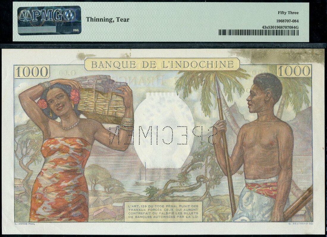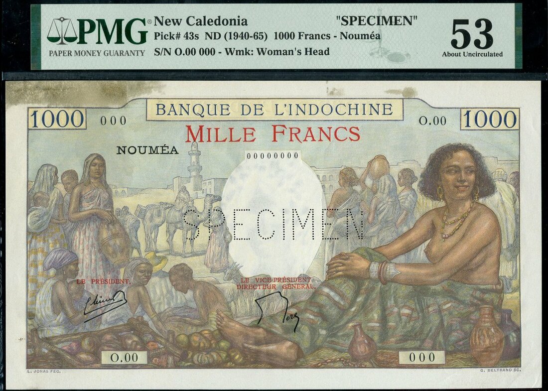 Banque de l'Indochine, New Caledonia, specimen 1000 francs, ND (1940-65), serial number 0.00 000, multicoloured, local woman at right, market scene and the Great Mosque in the background, signatures of Minost and Flers lower left and centre, NOUMEA in field, reverse a local youth with a spear at right and a maiden carrying a basket on her shoulder at left