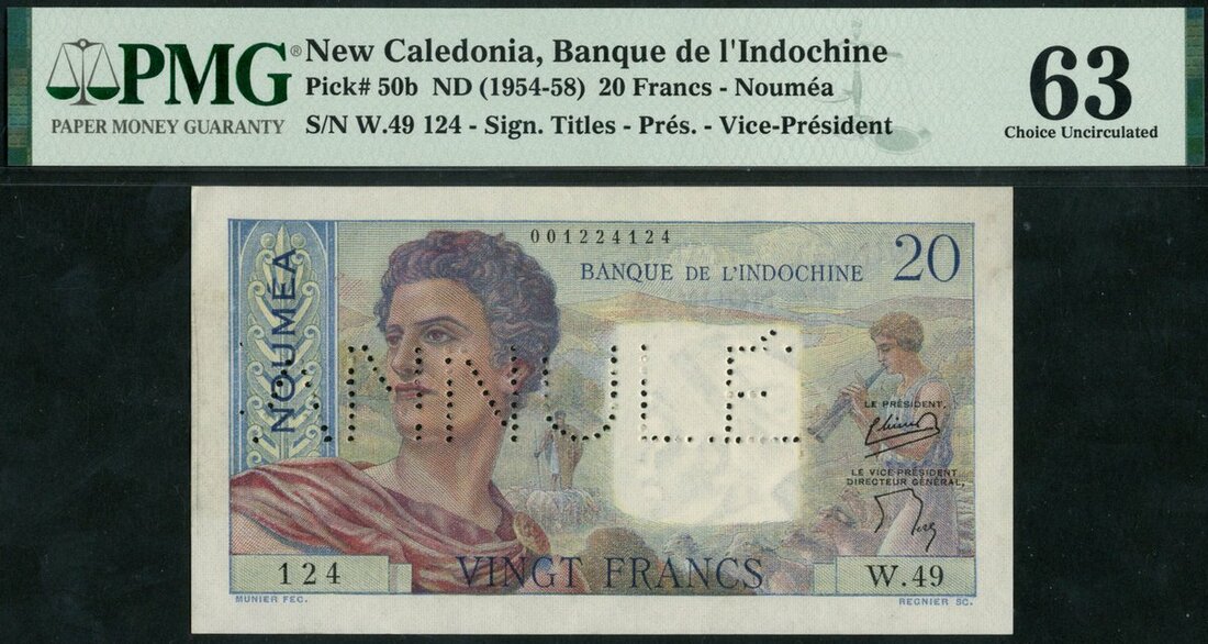 New Caledonia, Banque de l'Indochine, 20 francs, no date (1951-1958), prefix W.49, multicolour, youth at left, flute player at right, , the reverse shows a woman at right and fruit bowl at left, perforated 'ANNULE', 'Le Vice President Directeur General' variety