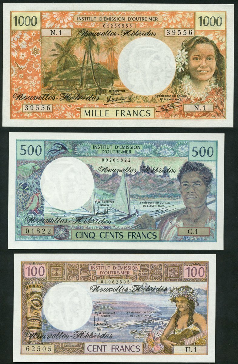 (x) Institut d’Émission d’Outre-Mer, New Hebrides, a set of the 1970-80 issues, including 100, 500, 1000 francs, (Pick 18d, 19b, 20d), uncirculated (3 notes)