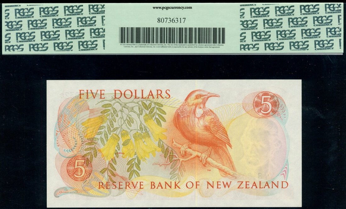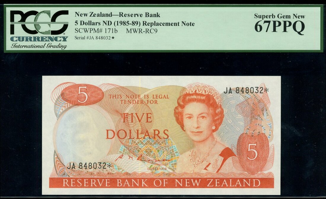 Reserve Bank of New Zealand, replacement 5 dollars, ND (1985-89), serial number JA 848032* orange, green and yellow, Queen Elizabeth II wearing Grand Duchess Vladimir's tiara and Queen Victoria's golden jubilee necklace, Spencer Thomas Russell signature, reverse, Kowhai (Sophora microphylla) tree and tui (Prosthermadera novaeseelandiae) bird,