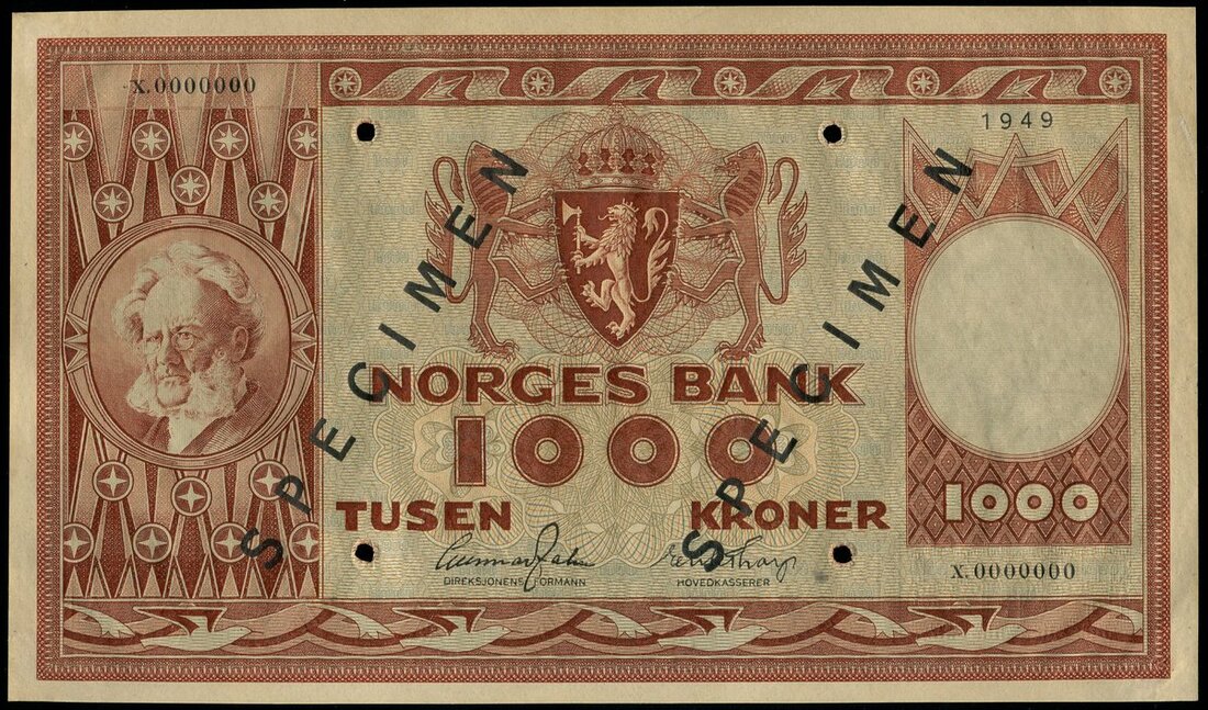 (x) Norges Bank, Norway, specimen 1000 kroner, 1949, serial number X. 0000000, (Pick 35s), previously mounted with mounting traces on reverse, otherwise very presentable about uncirculated, with wrinkled paper