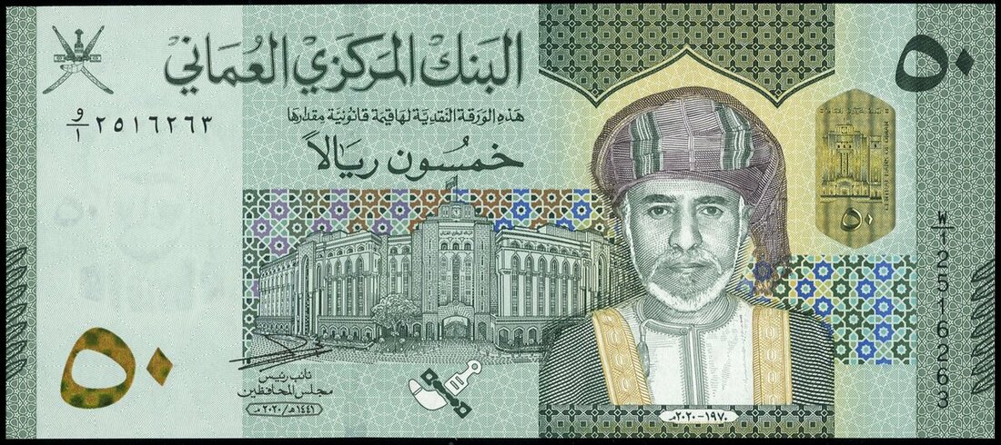 (x) Central Bank of Oman, 50 rials, 2020, commemorative issue, serial number 2016263, (Pick unlisted), To commemorate the 50th anniversary of the Omani Renaissance and its later founder Sultan Qaboos bin Said, uncirculated