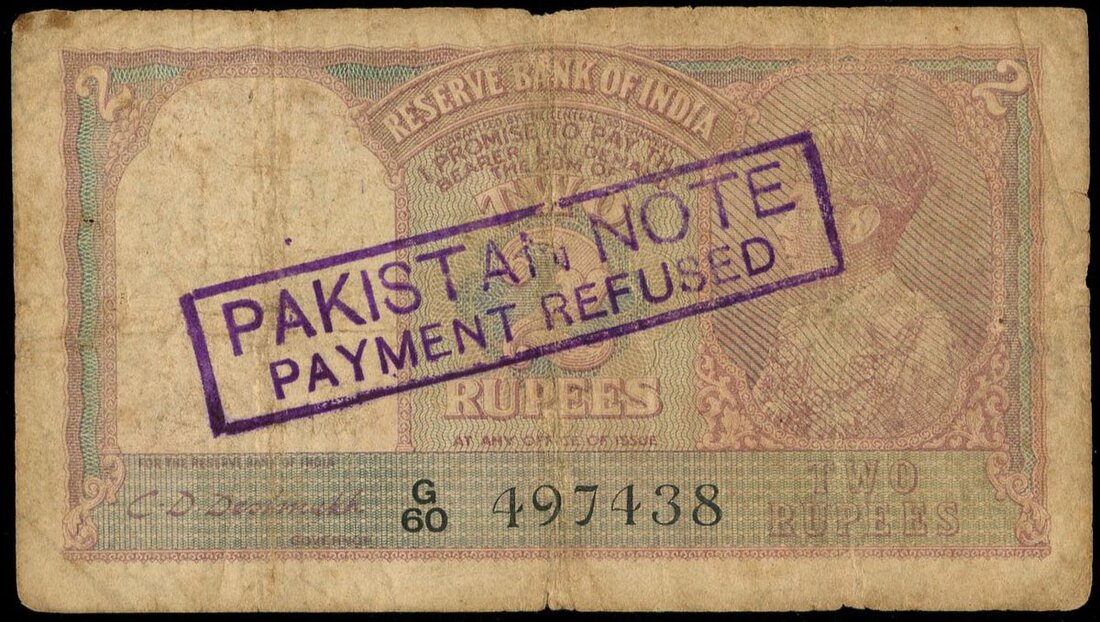 Reserve Bank of India, Pakistan 2 rupees, 1 April 1948, serial number G60 497438, (Pick 1A, TBB B102a), violet overprint, PAKISTAN NOTE PAYMENT REFUSED, very good to about fine