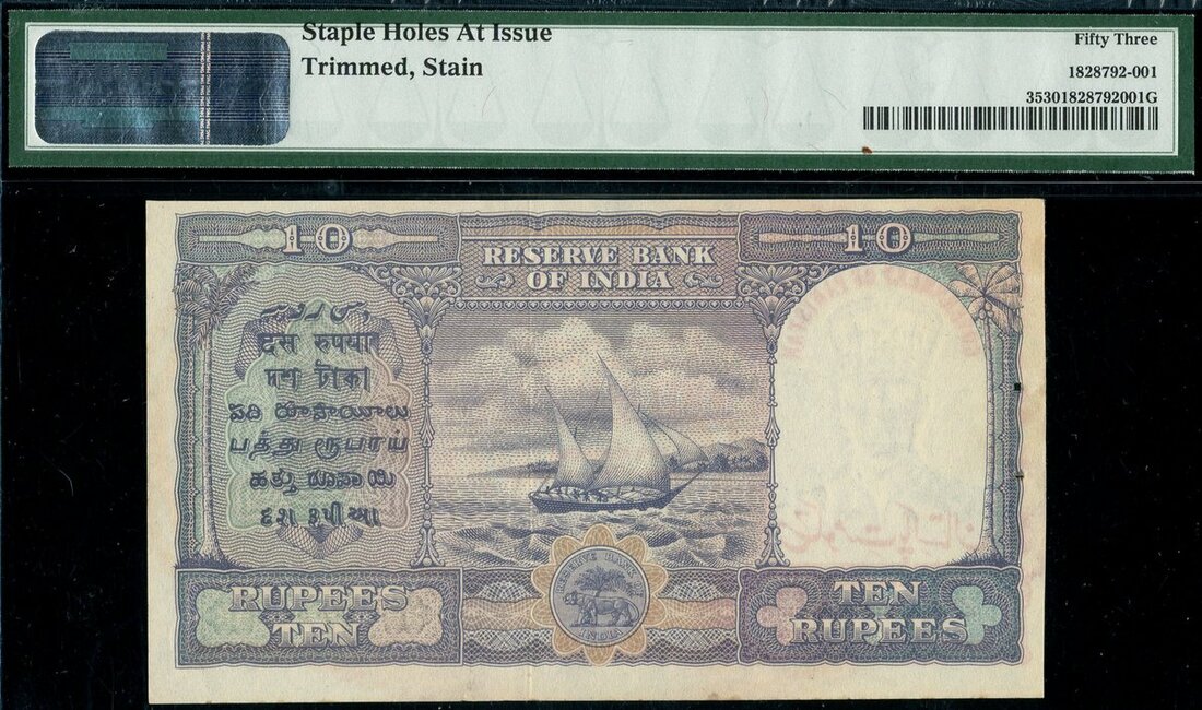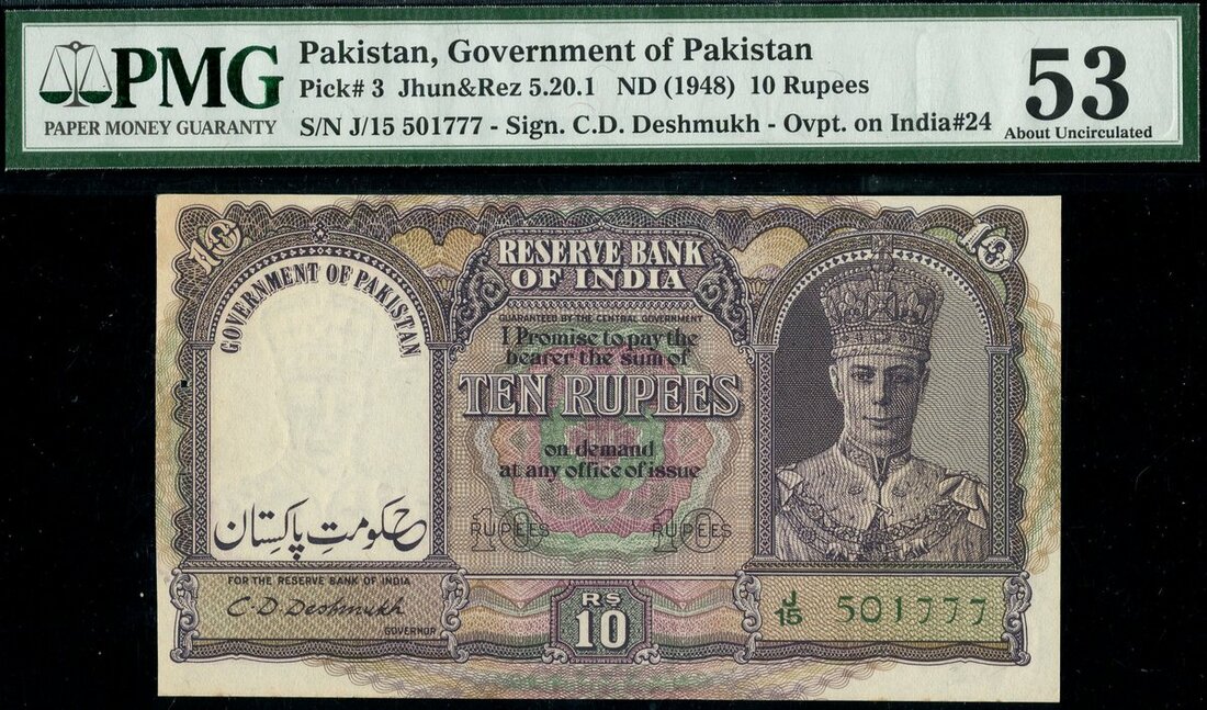 Reserve Bank of India, Pakistan, 10 rupees, ND (1948), serial number prefix J/15, purple on multicolour underprint, George VI at right, reverse purple, dhow at centre