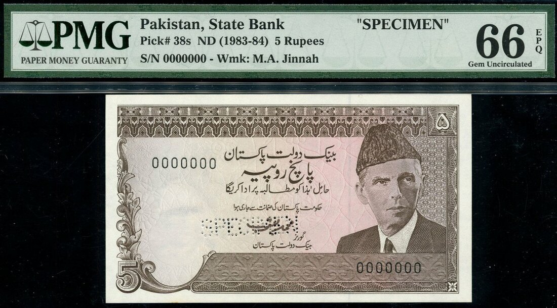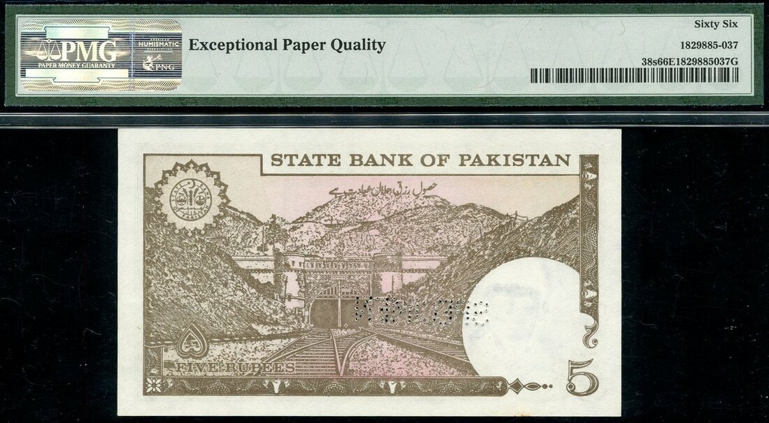 State Bank of Pakistan, 5 rupees, specimen, no date (1983-84), serial number 0000000, brown on pink, Ali Jinnah at right, reverse, Khaljak railroad tunnel,