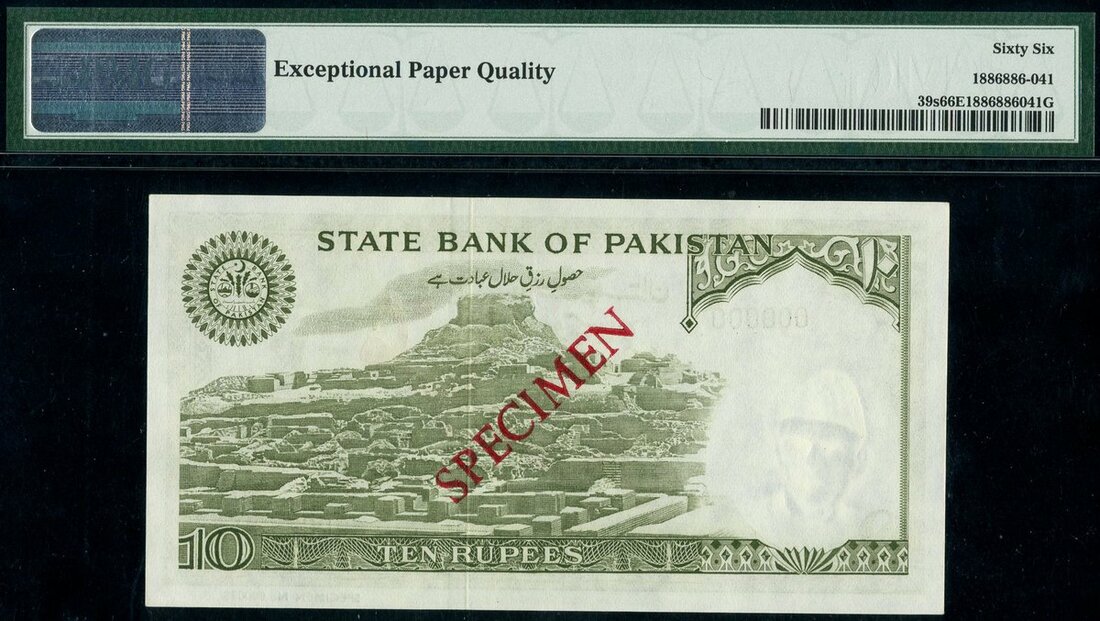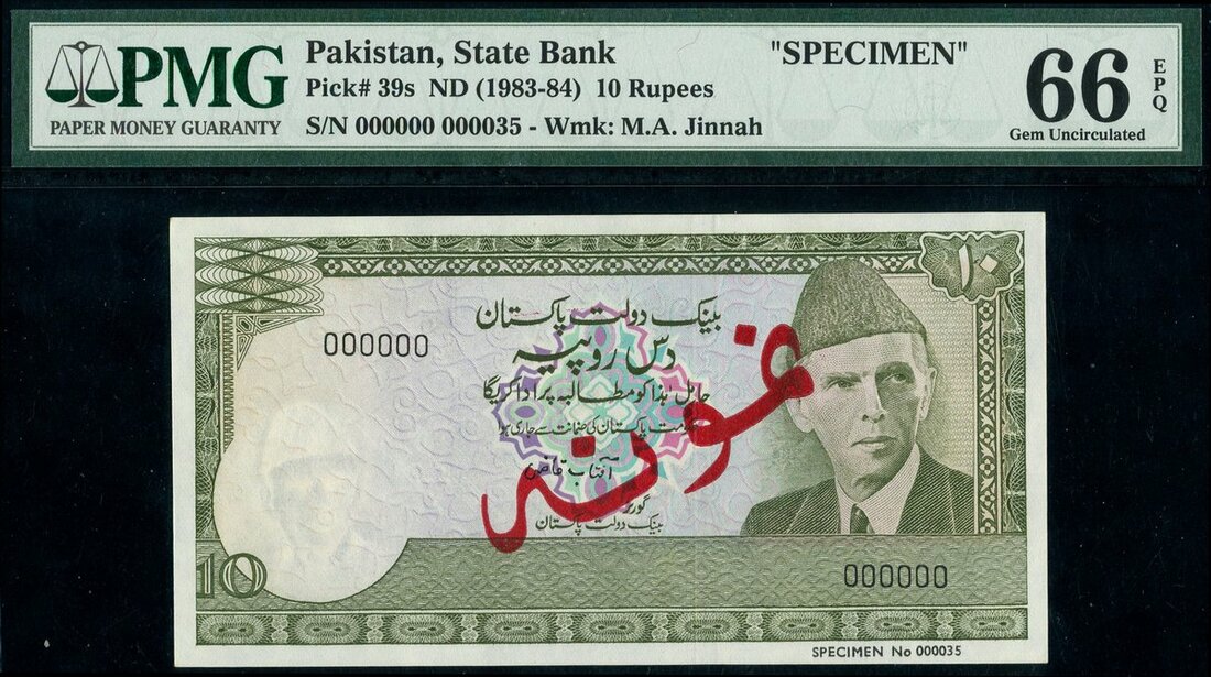 State Bank of Pakistan, 10 rupees, specimen, no date (1983-84), serial number 000000, green on multicolour, Ali Jinnah at right, reverse, view of Moenjodaro,
