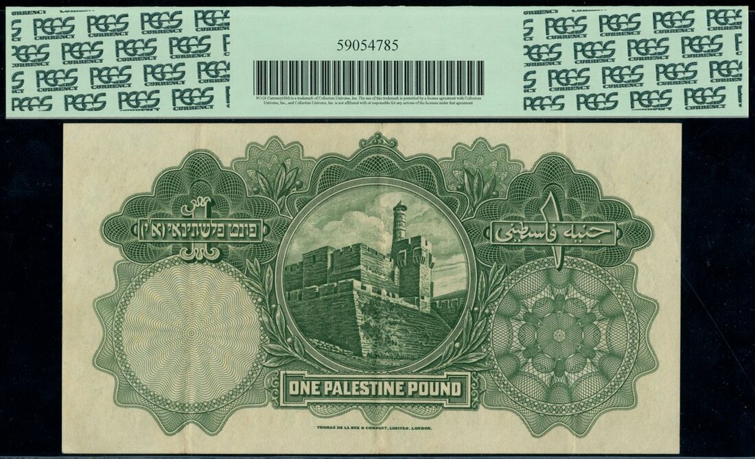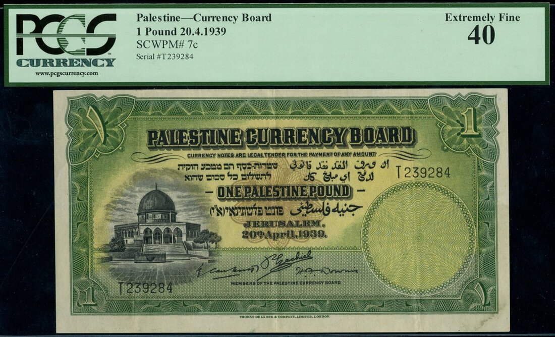 (x) Palestine Currency Board, £1, 20 April 1939, serial number T239284, black on green and yellow, Dome of the Rock at left signatures of P. H. Ezechiel, J. Caulcutt and H. F. Downie, reverse green, Tower of David at centre