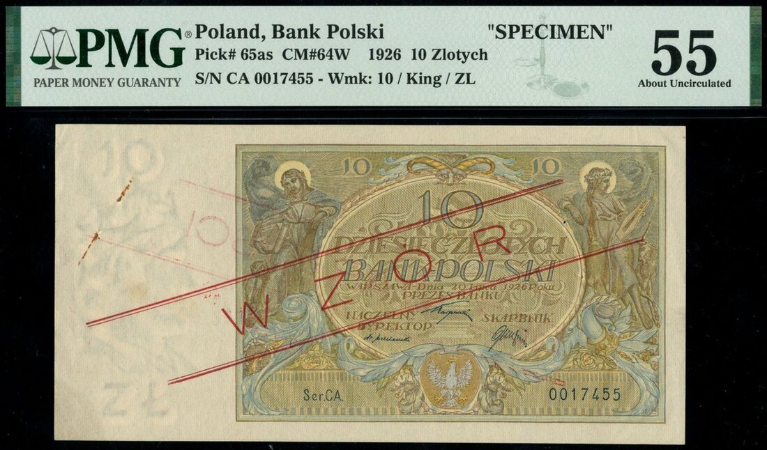 Bank Polski, specimen 10 zlotych, 1926, serial number CA 0017455, pale blue and pale brown, maiden at left and right