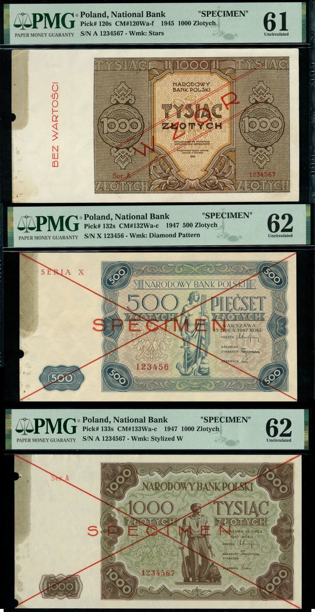 Narodowy Bank Polski, specimen 1000 zlotych, 1945, red serial number 1234567, brown and pale orange, eagle at centre, value at left and right, reverse brown, also specimen 500 zlotych, 1947, blue, maiden at centre, also 1000 zlotych, 1947, purple and pale green, steel workman at centre