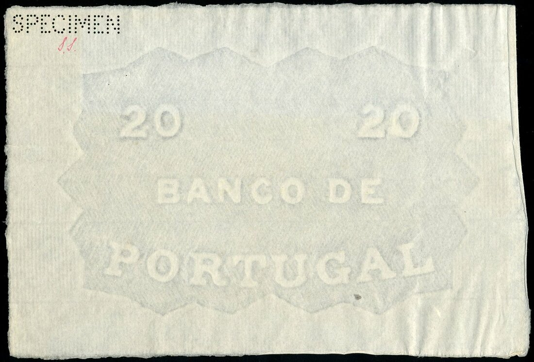 Banco de Portgual, watermark paper for 20 Reis/Escudo, "20 BANCO DE PORTUGAL 20" at centre, jagged border, perforated specimen