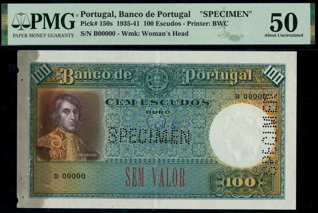 Banco de Portugal, specimen 100 escudos, 1941, Ch 5, serial number B 00000, green, blue and orange, Ribeiro at left, arms top centre