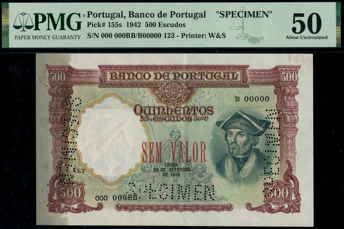 Banco de Portugal, specimen 500 escudos, 29 September 1942, Ch 7, serial number 000 000BB/B00000 123, purple and green, D. de Goes at right, arms top centre