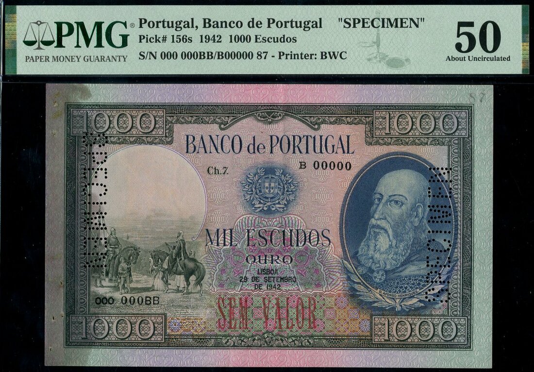 Banco de Portugal, 1000 escudos, specimen 1000 escudos, 28 September 1942, Ch 7, serial number B 00000, green and blue and pink, D. Afonso Henriques in oval at right, knight and Arab on horseback at left, arms top centre, reverse green and pink and orange, Afonso Henriques's tomb in Coimbra