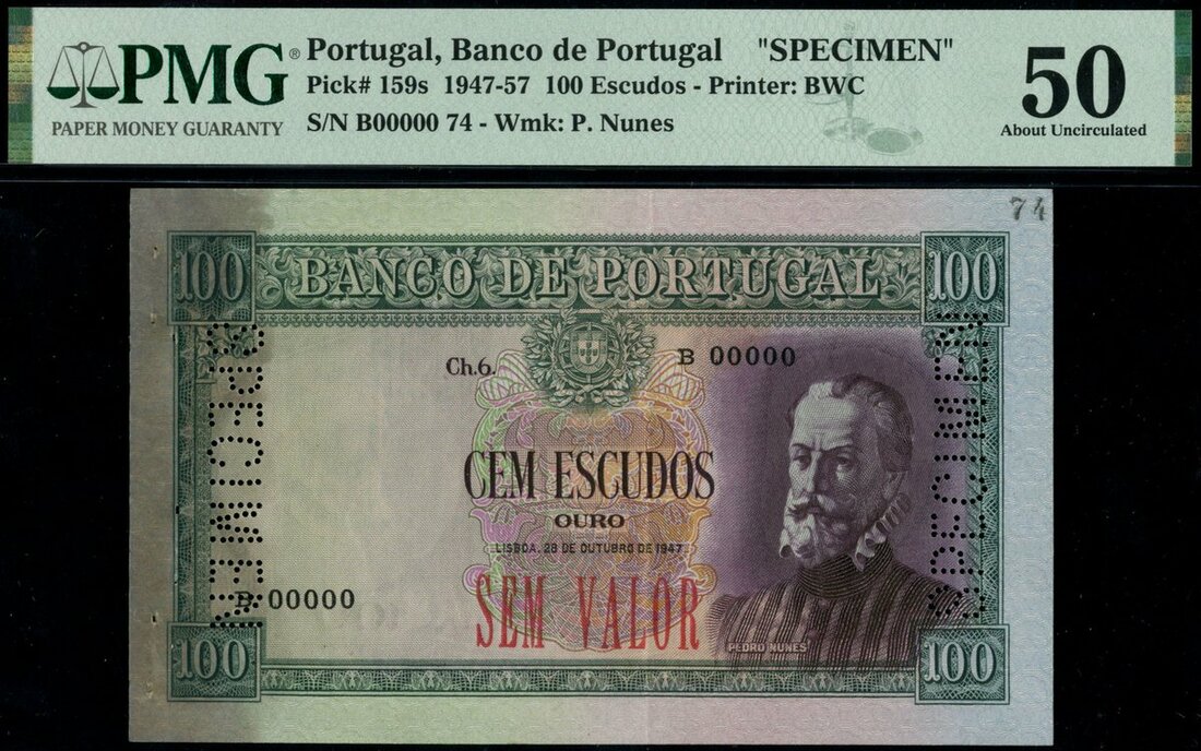 Banco de Portugal, specimen 100 Escudos, 28 October 1947, Ch 6, serial number B 00000, green and purple, Pedro Nunes at right, arms top centre, reverse brown-purple, fountain and arches, medallic female helmeted head at left