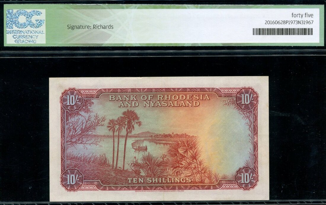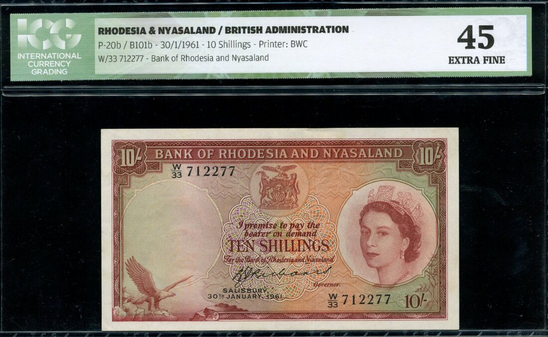 Bank of Rhodesia and Nyasaland, 10/-, 30 January 1961, serial number W/33 712277, brown, coat of arms at upper centre, Queen Elizabeth II at right, reverse trees and boat along the river bank,