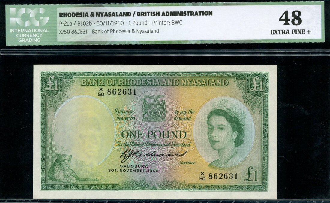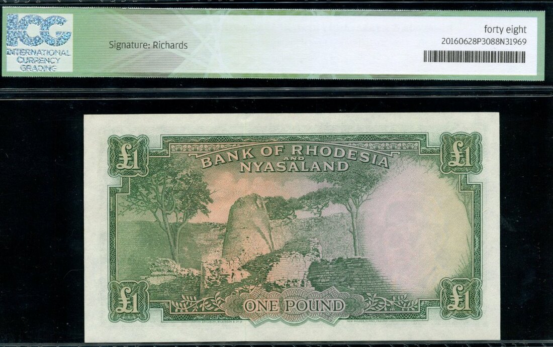 Bank of Rhodesia and Nyasaland, £1, 30th November 1960, serial number X/50 862631, green, Leopard at lower left, coat of arms at upper centre, Queen Elizabeth II at right, signature of B. C. J. Richards, reverse, Great Zimbabwe ruins,