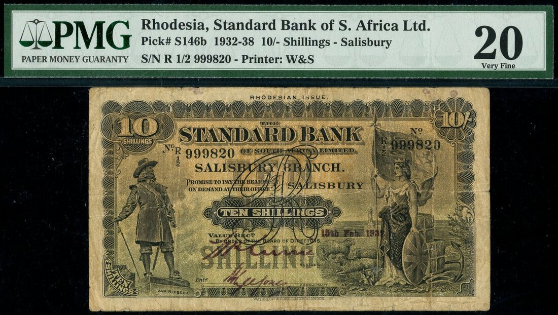 (x) Standard Bank of South Africa Limited, Rhodesia 10 shillings, 1932-38, serial number 1/2 999820, (Pick S146b), in PMG holder 20 Very Fine