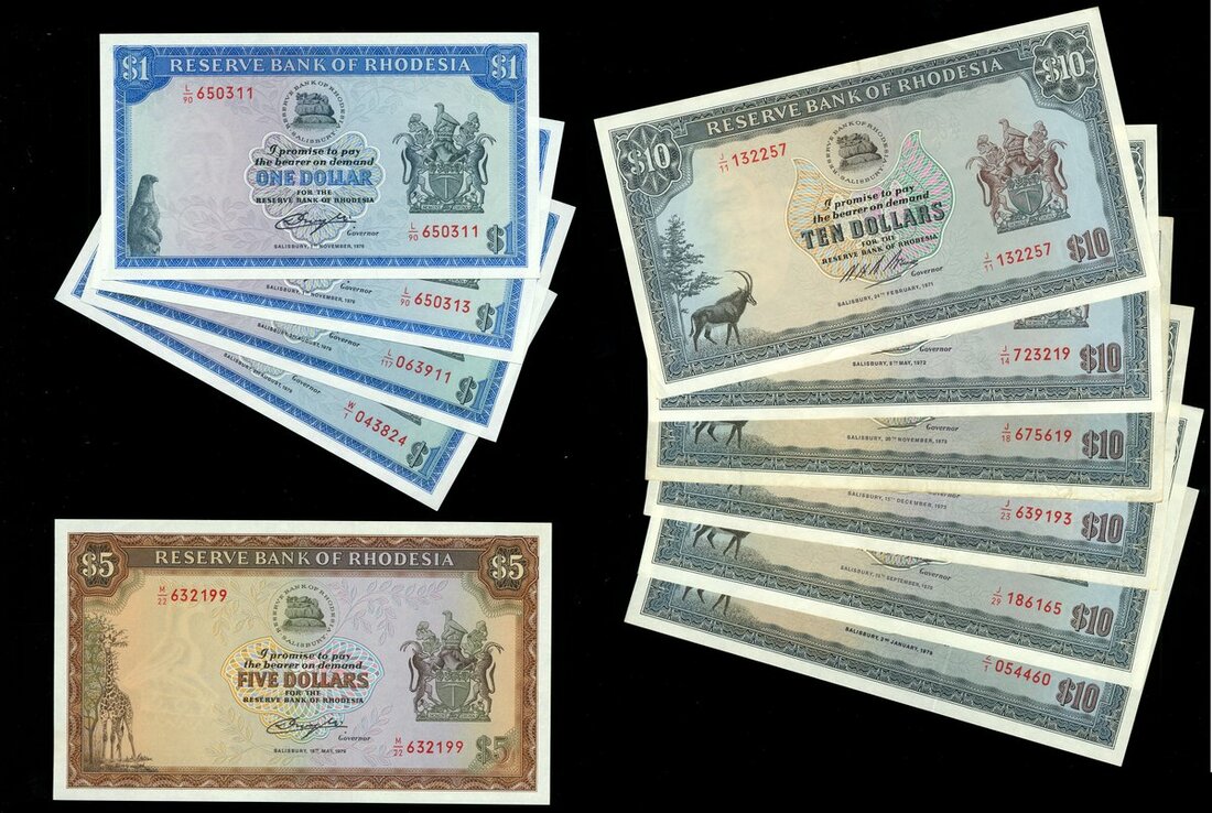 (x) Reserve Bank of Rhodesia, $1 (4), 1976, 1979, $5, 1979, replacement $10, 1979, $10 (5), 1971, 1972, 1973, 1978, (Pick 33c, d, e, f, g, 34b, 38, 39), 1971 $10 scarcer date, $1, $5 and replacement $10 uncirculated, remaining notes very fine or better (11 notes)