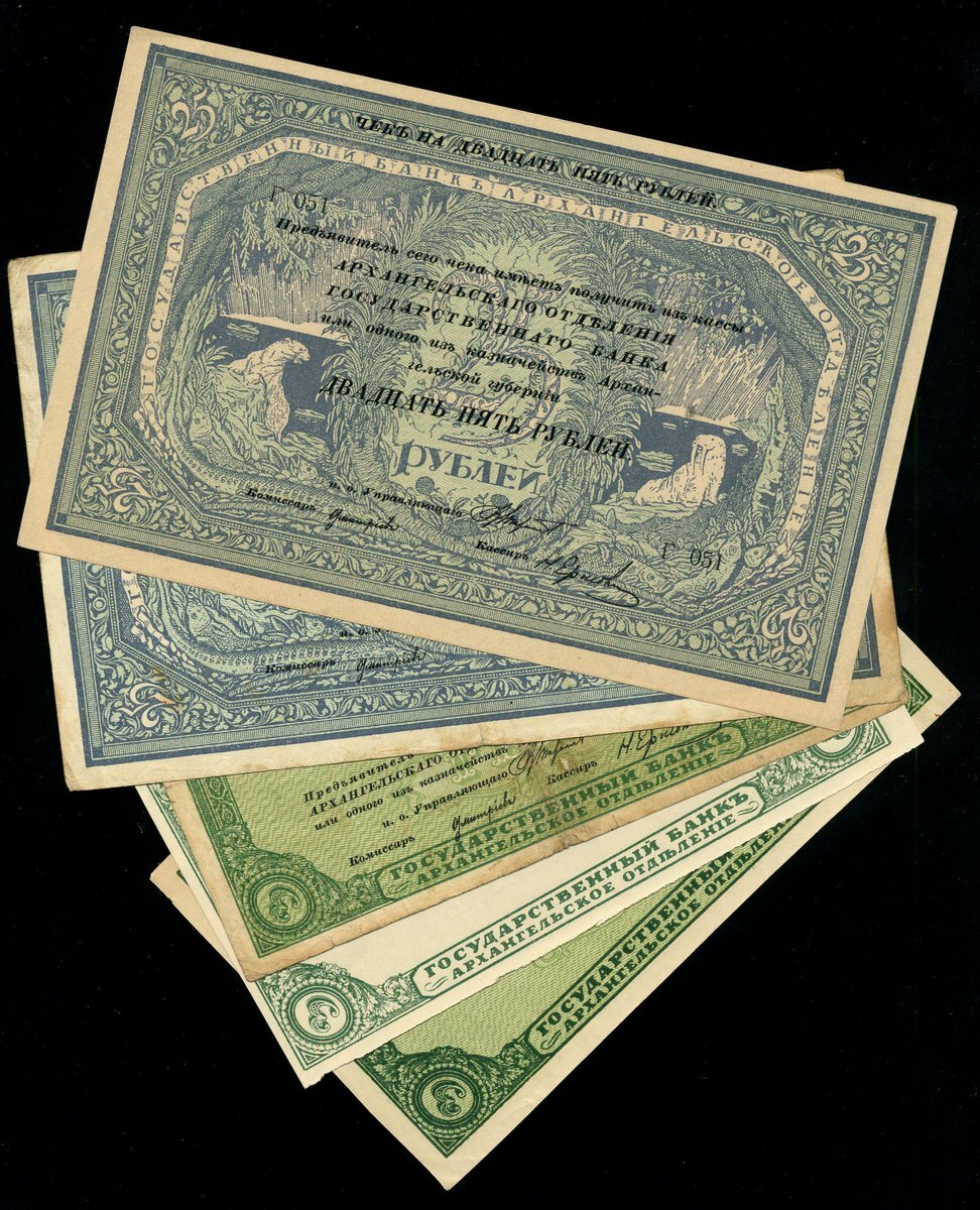 (x) Archangel Government, Red Regime, proof 3 rubles, ND (1918), green and white, 3 rubles, green, all fasces top left and right, also 3 and 10 rubles with White Regime overprint, also 25 rubles (2), blue, walrus at left and right, also 25 rubles with White Regime overprint