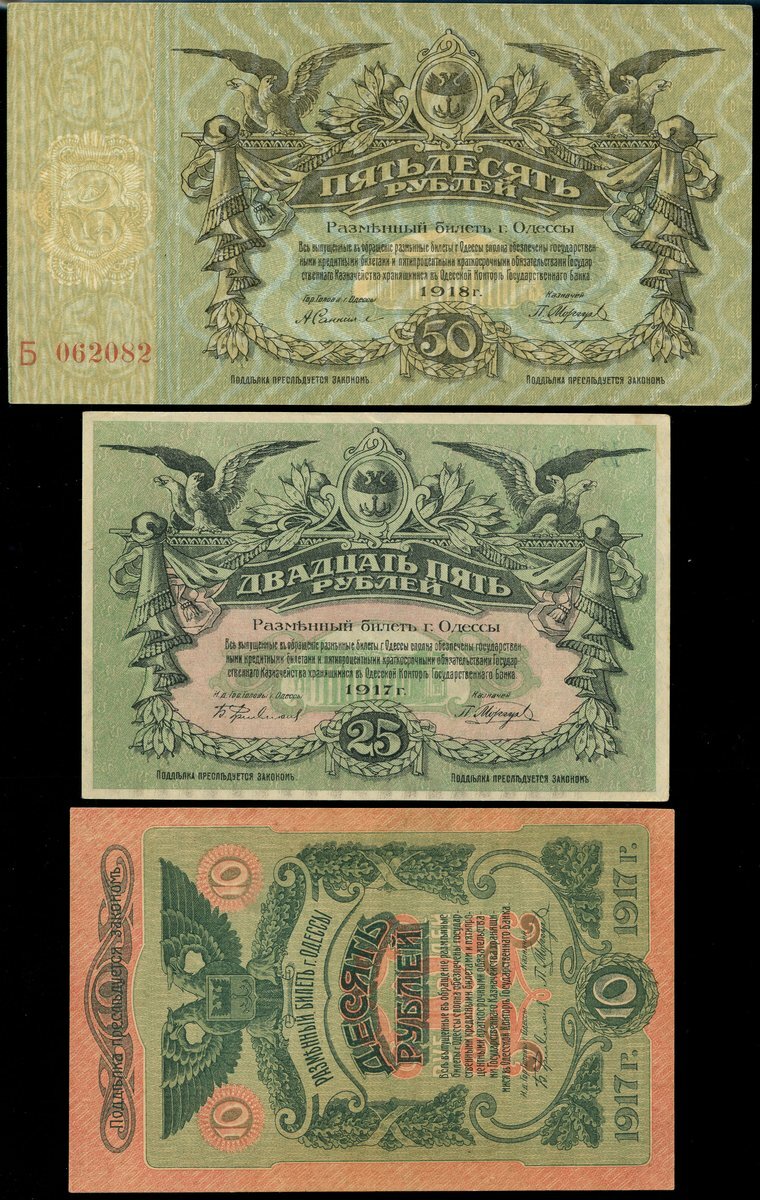(x) Odessa Exchange notes, 10, 25 and 50 rubles, 1917/1918, all eagles in field