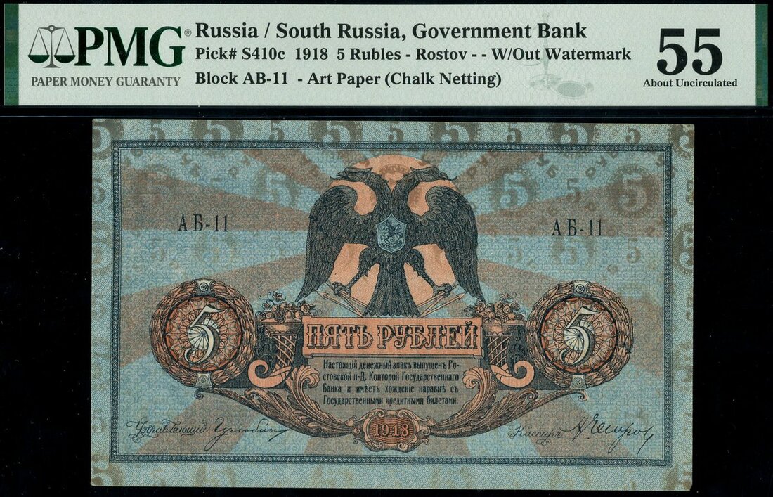 (x) Rostov Government Bank, 5 rubles, 1918, series AB-11, blue and pink, eagle top centre, sunburst design in background, reverse blue and pink, value at centre