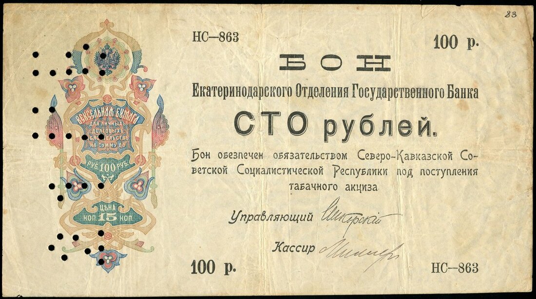 (x) Ekatarinodar, State Bank voucher issue, 100 rubles, ND (1918), black and white, multicoloured guilloche at left