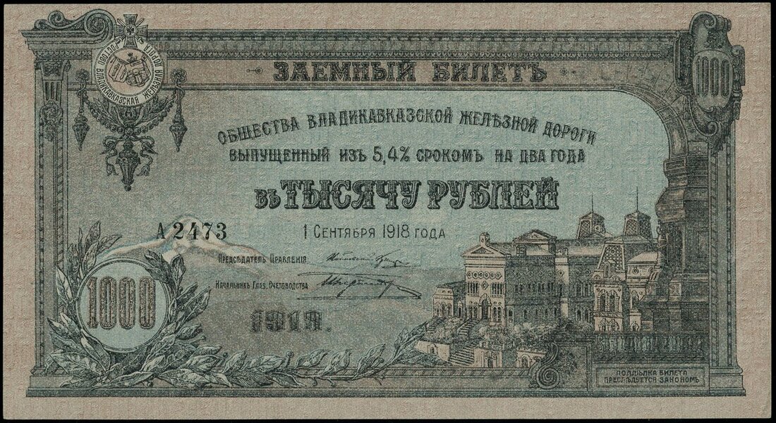 (x) Vladikavkaz Railroad Company, Russia, 1000 rubles, 1918, serial number A2473, (Pick S596), some handling, about uncirculated, rare in this grade