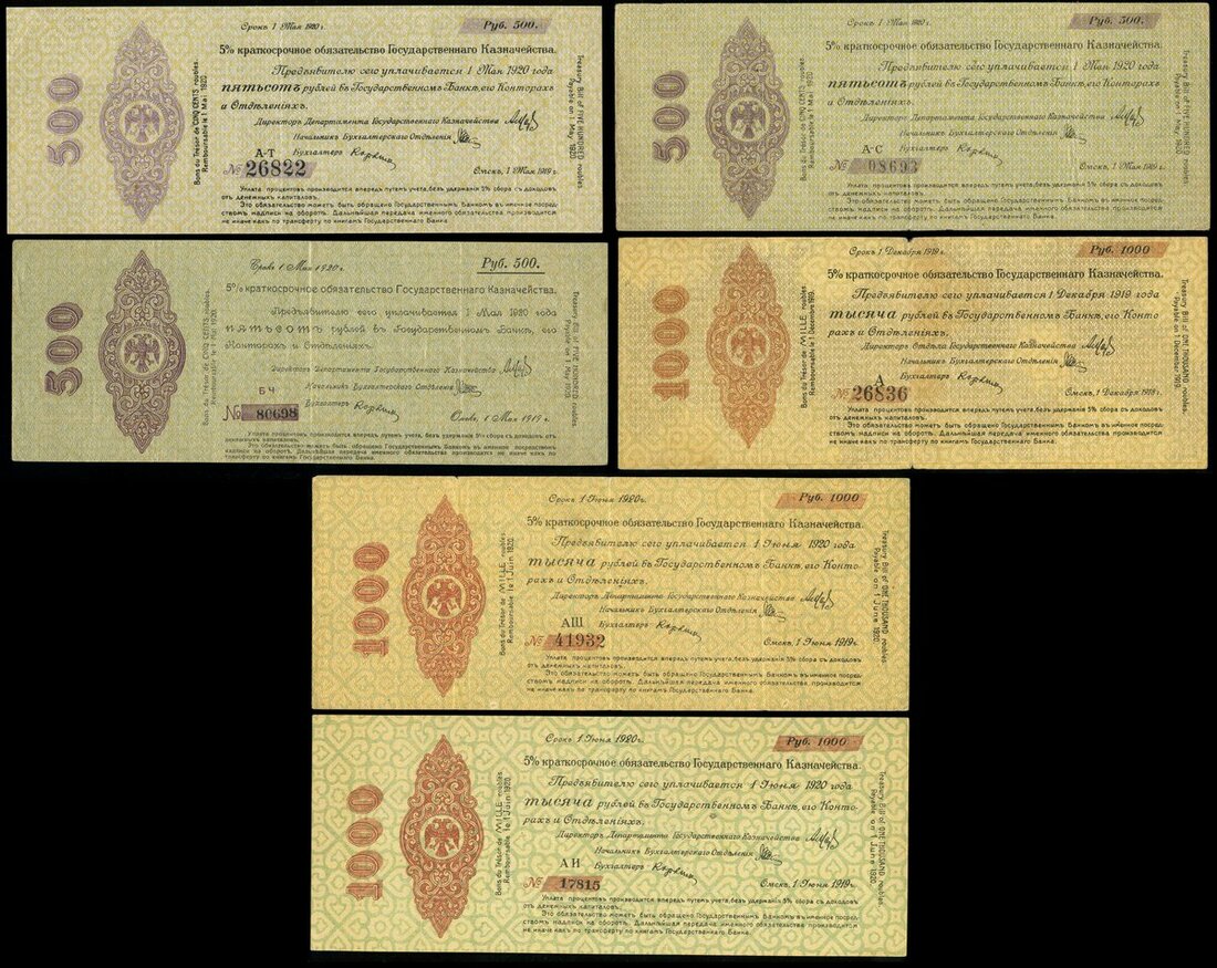 (x) Russia, State Treasury 5% obligation loans for 5000 rubles (3), 1917-1919, long format value and arms at left, also Siberian Government Debenture issue, 500 and 1000 rubles, 1919