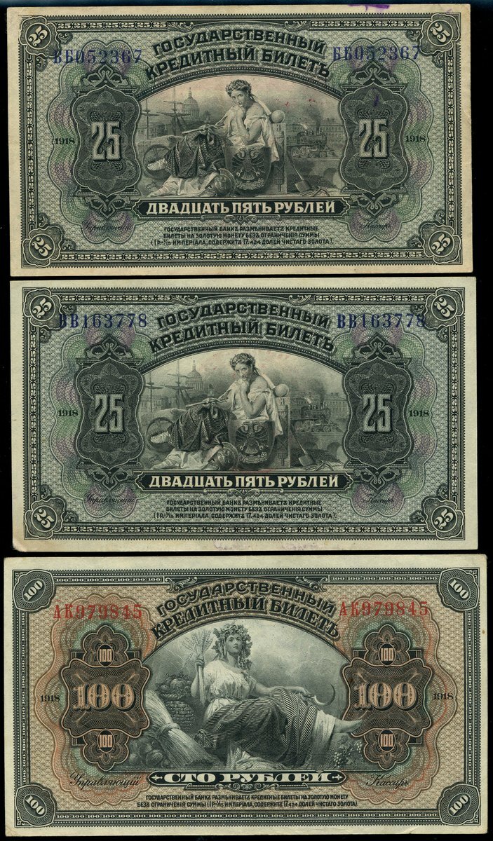 (x) East Siberia, Provisional Power of the Pribaikal Region, 25 rubles (2), 1918 (1920), red overprint on reverse, also 100 rubles (2) with blue overprint on reverse, also Far Eastern Republic, Government Credit note Provisional issue, 25 rubles, 1918 (1921), red overprint on reverse, both blue serial numbers