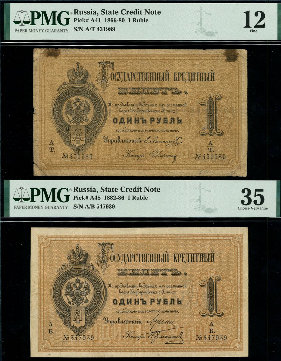 (x) State Credit Notes, Russia, 1 ruble, 1872, serial number A/T 451989, black on brown underprint, monogram of Alexander II below double headed eagle at left, also 1 ruble, 1882, serial number A/B 547939, black on brown underprint, monogram of Alexander III below double headed eagle at left,