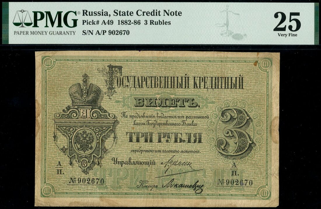 (x) Russia, State Credit Note, 3 rubles, 1882, serial number A/P 902670, black on green underprint, crowned double headed eagle above monogram of Czar Alexander III at left, reverse, date a centre flanked by value in ornate circular panels