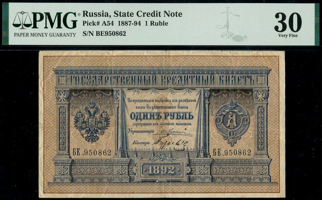 (x) Russia, State Credit notes, 1 ruble, 1892, serial number BE 950862, blue and pale brown, arms at left, monogram of Tsar Alexander III at right, Zhukovski signature, reverse brown, arms and value and text