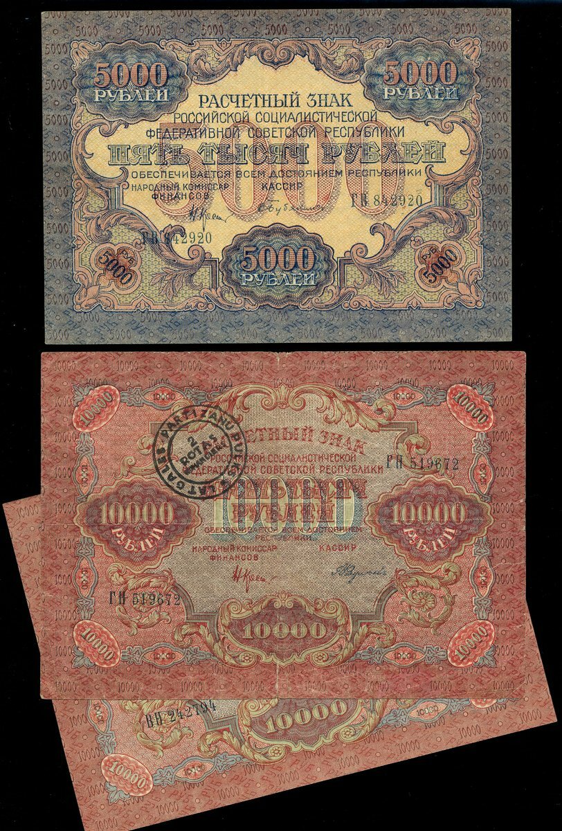 (x) Currency notes, 5000 rubles, 1919, blue and 10000 rubles, 1919, pink, both arms at centre and text 'PROLETARIATES DE TOUS LES PAYS, UNISSEZ-VOUS...', also another 10000 rubles with circular 'PARTIZANU handstamp