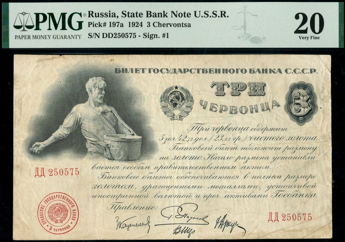 (x) Russia, State Bank note, 3 chervontsa, 1924, red serial number DD 250575, black and white, farmer sowing seed top left, arms and value top centre and at right, red seal low right, four printed signatures low centre
