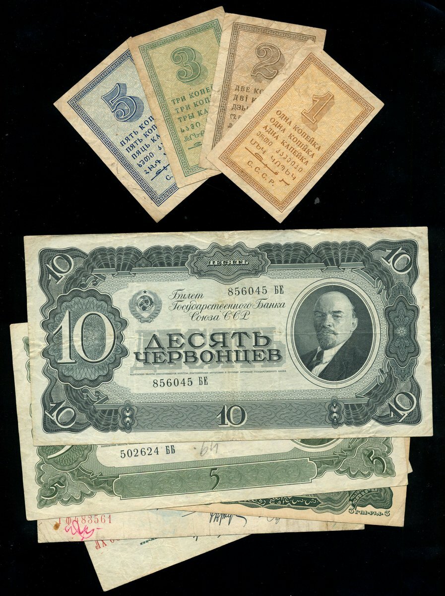 (x) U.S.S.R., State Bank notes, 1 chervonetz, 1926, serial number GF 483561, black and white, arms top left, signature 3, also 3 chervotsa, 1932, serial number LX 085588, green and white, arms top centre, value at left and right, also 3 rubles, 1925, green and white, arms top centre, also 5 and 10 chervontsev, 1937, Lenin at right, also small change notes, 1924, 1, 2, 3 and 5 kopeks