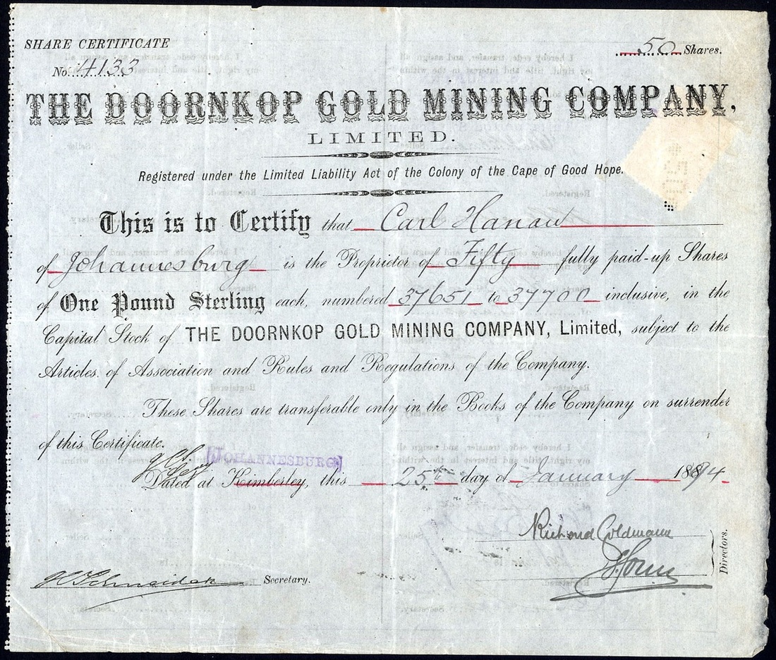 South Africa: Doornkop Gold Mining Co. Ltd., £1 shares, 188[94], #4133, issued to Carl Hanau and signed by him as transferor on the reverse, black. Hanau was a German Jewish immigrant to the gold fields where he became a partner is S. Neumann & Co. He was one of the first into the Nigel District and was instrumental in the developing the Sub Nigel Mine. Interestingly the shares were later transferred to Neumann who also signs on the reverse. He became one of the most influential Rand magnates but put much hope in the new Heidelberg district which was not as rich as expected and his mines collapsed. He died in poverty in England in 1930. VF.
