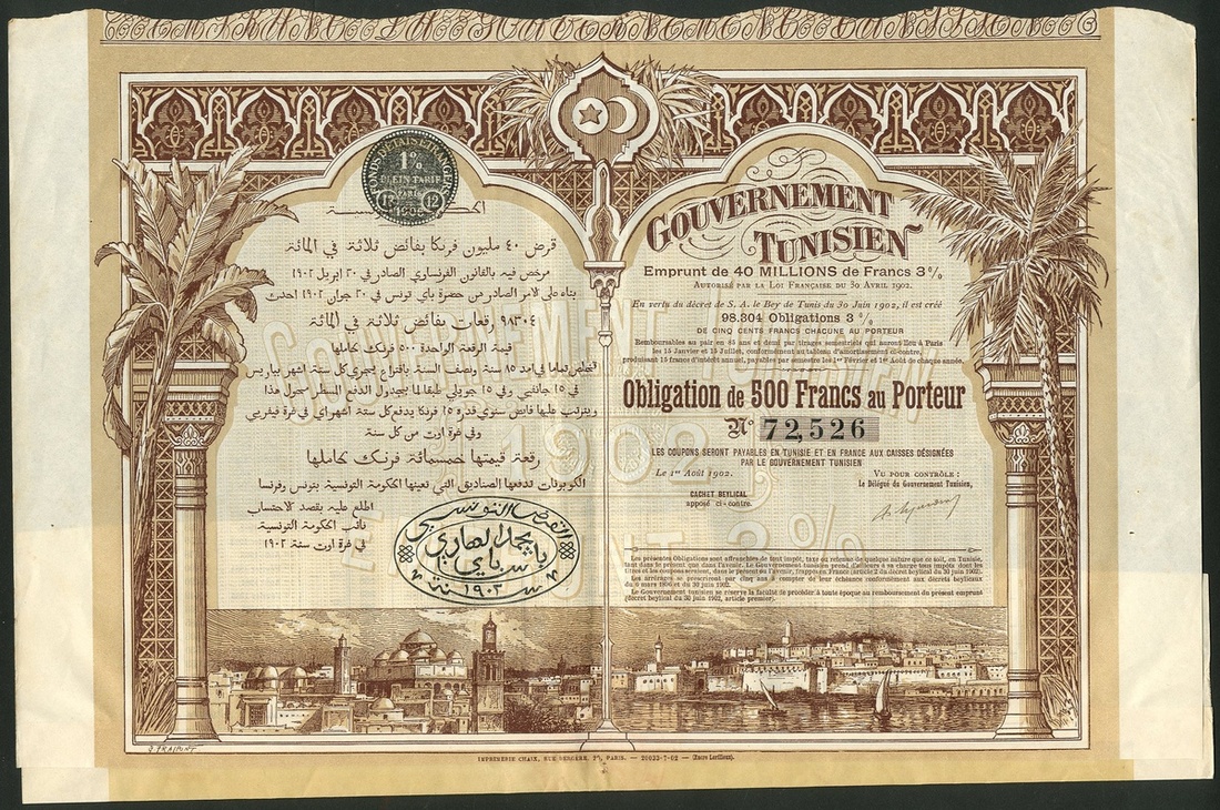 Tunisia: Gouvernement Tunisien, 3% Loan, 1907, bond for 500 francs, #72526, attractive piece with Moorish borders, brown and yellow, text in arabic and French, city views at bottom, with coupons. GVF.