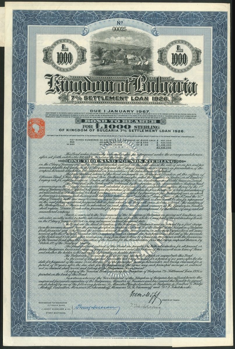 Bulgaria: 1926, 7% Settlement Loan, bond for £1000, #00025, peasants in wheat field, ornate border, blue and black, printed by Bradbury, Wilkinson, with coupons. AEF and rare, only 467 issued.