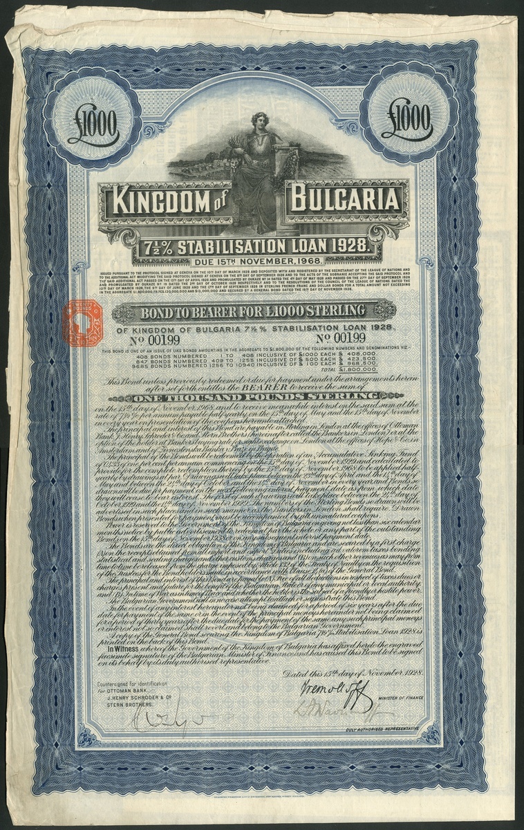 Bulgaria, 7½% Stabilisation Loan, 1928, bond for £1000, #0199, of only 408 issued, large format piece with vignette of allegorical figure, ornate border, blue and black, printed by Bradbury, Wilkinson & Co., with coupons. AVF rare.