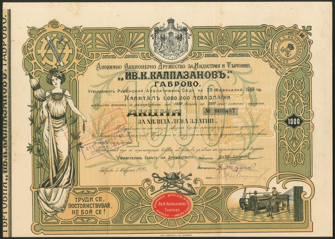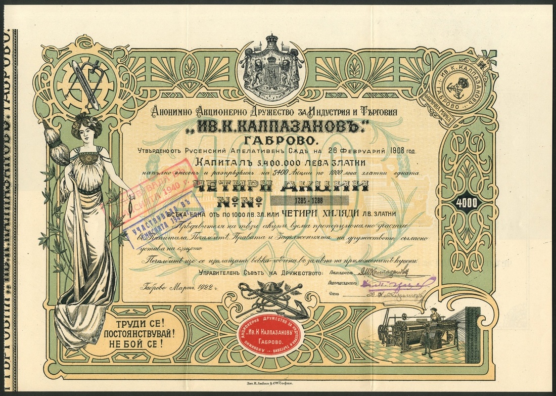 Bulgaria: IV. K. Kappazanova, Gabrovo, a pair of certificates for 1000 and 4000 Lev, 1920 and 1922 respectively, allegorical female to left in border, large weaving loom bottom right, seal/arms at top, text all in Bulgarian, both with coupons, green, yellow and black. Both GVF (2).