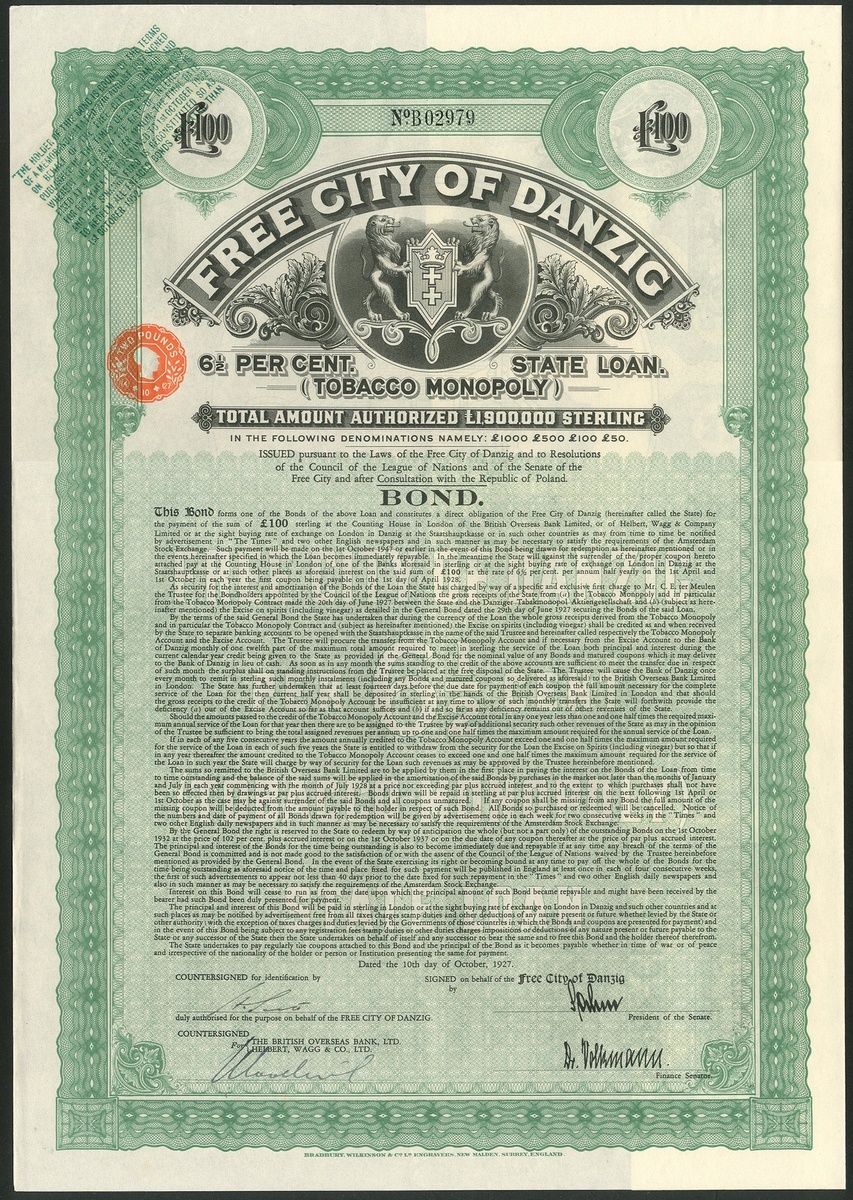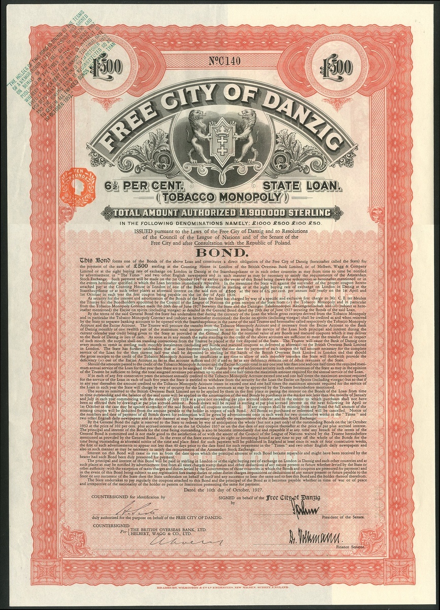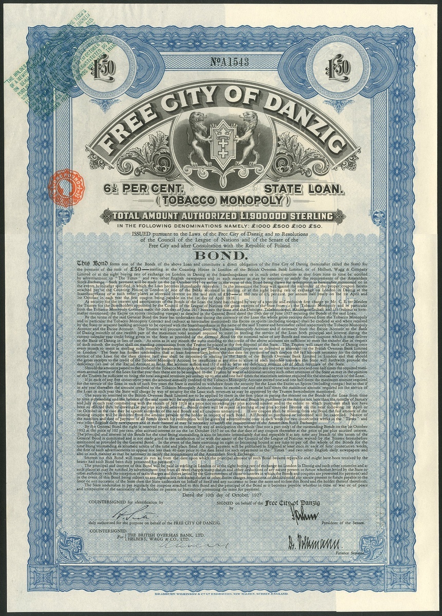 Free City of Danzig, 6½% State Loan (Tobacco Monopoly), an extremely rare set of bonds comprising £50, #A1543, £100, #B02979, £500, #C140 and £1000, #D044, large format, city arms at top, blue, green, red and brown respectively, printed by Bradbury, Wilkinson & Co., with coupons from 1940. EF and extremely rare, from a small group found last year (4).