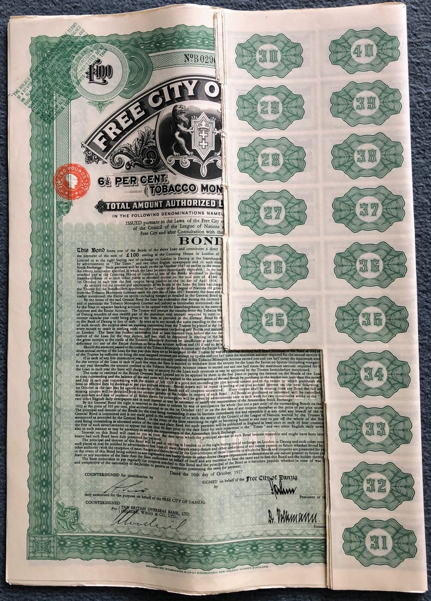 Danzig: Free City of Danzig, 1927, 6½% State Loan (Tobacco Monopoly), a group of 10 bonds for £100, consecutively numbered B2969-A2978, arms at top, ornate border, green and black, printed by Bradbury, Wilkinson, with coupons. Virtually uncirculated (10).