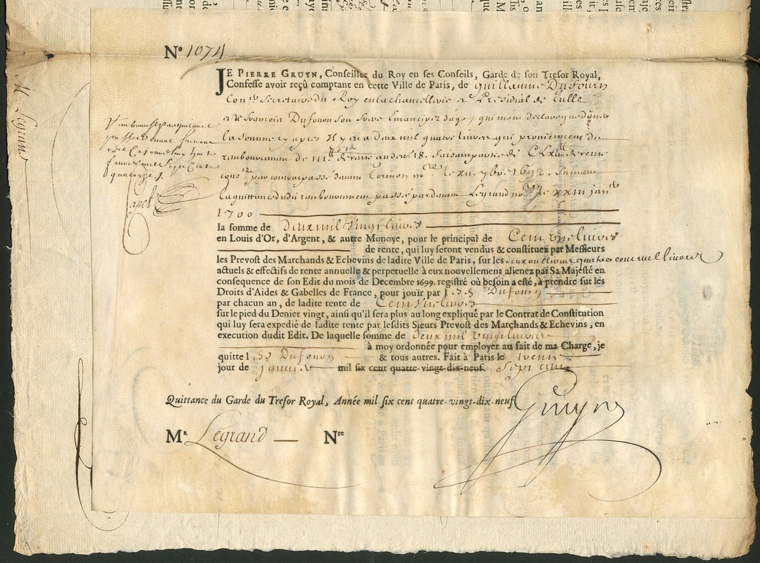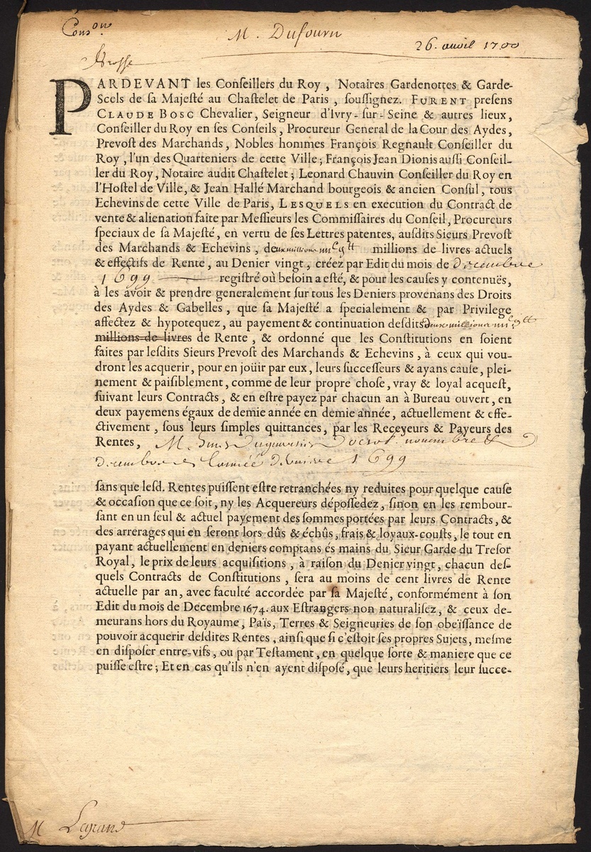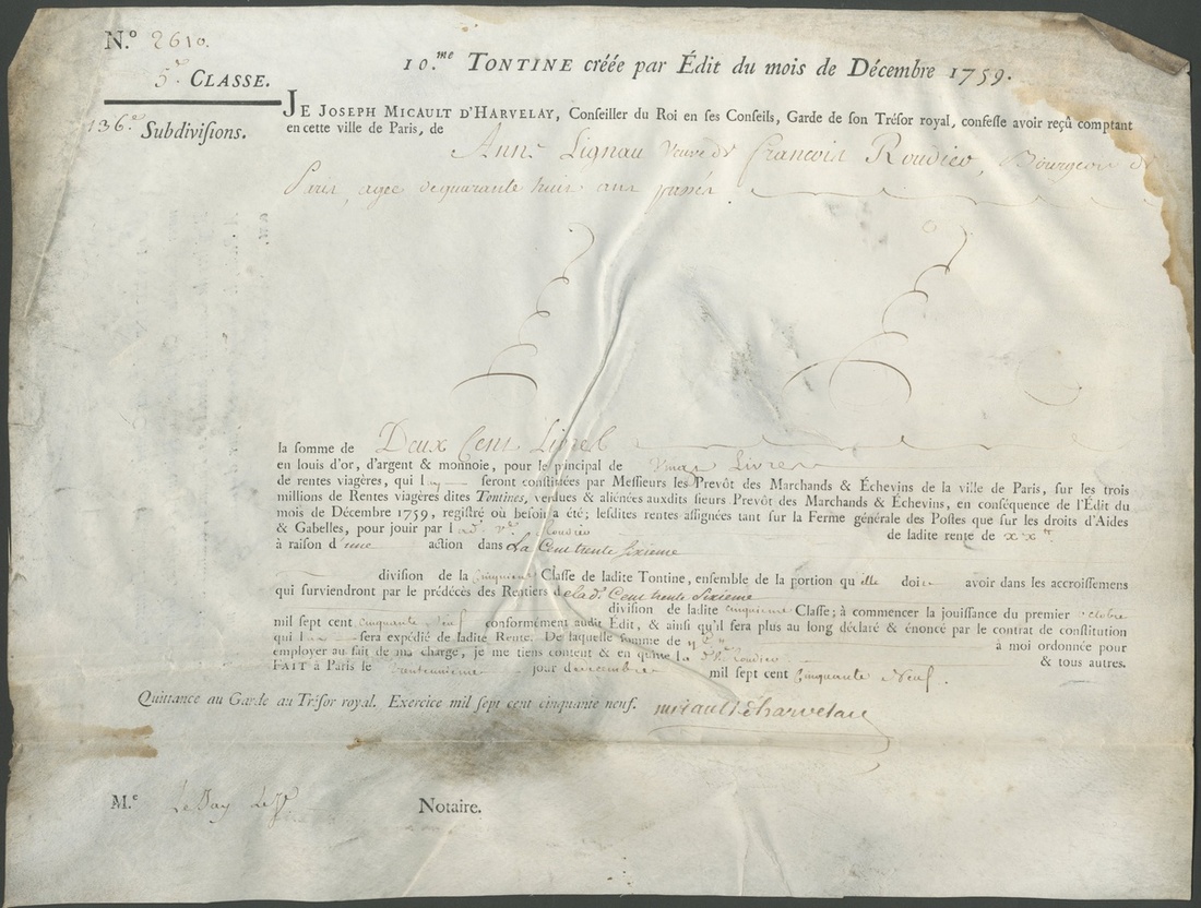 France: Government Loan - Rente, Edict of December 1699, emission 2 million, comprises contract and vellum quittance, black, bound together (Shakespeare 992 - he notes not seen). Small tear top right otherwise GVF. Together with a quittance for Tontine issued under Edict of December 1759.
