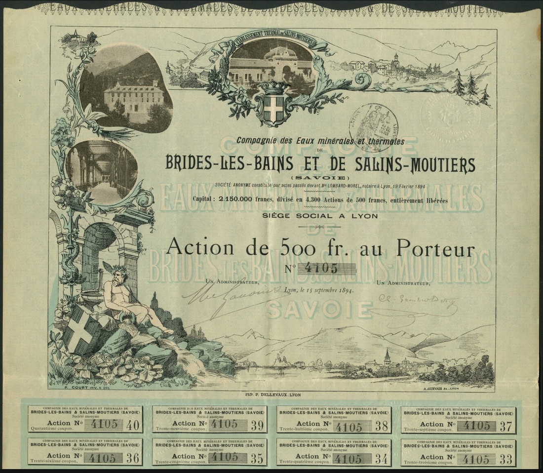 France: Compagnie des Eaux Minérales et Thermales de Brides-Les-Bains et de Salins-Moutiers (Savoie), 500 franc share, Lyon 1894, #4105, vignettes of the thermal baths and buildings, Neptune sits on some rocks to the left, black with blue underprint, with coupons. The thermal waters of this skiiing region have been well known since Roman times and reached its peak during the Belle Epoque of the 19th century. VF.