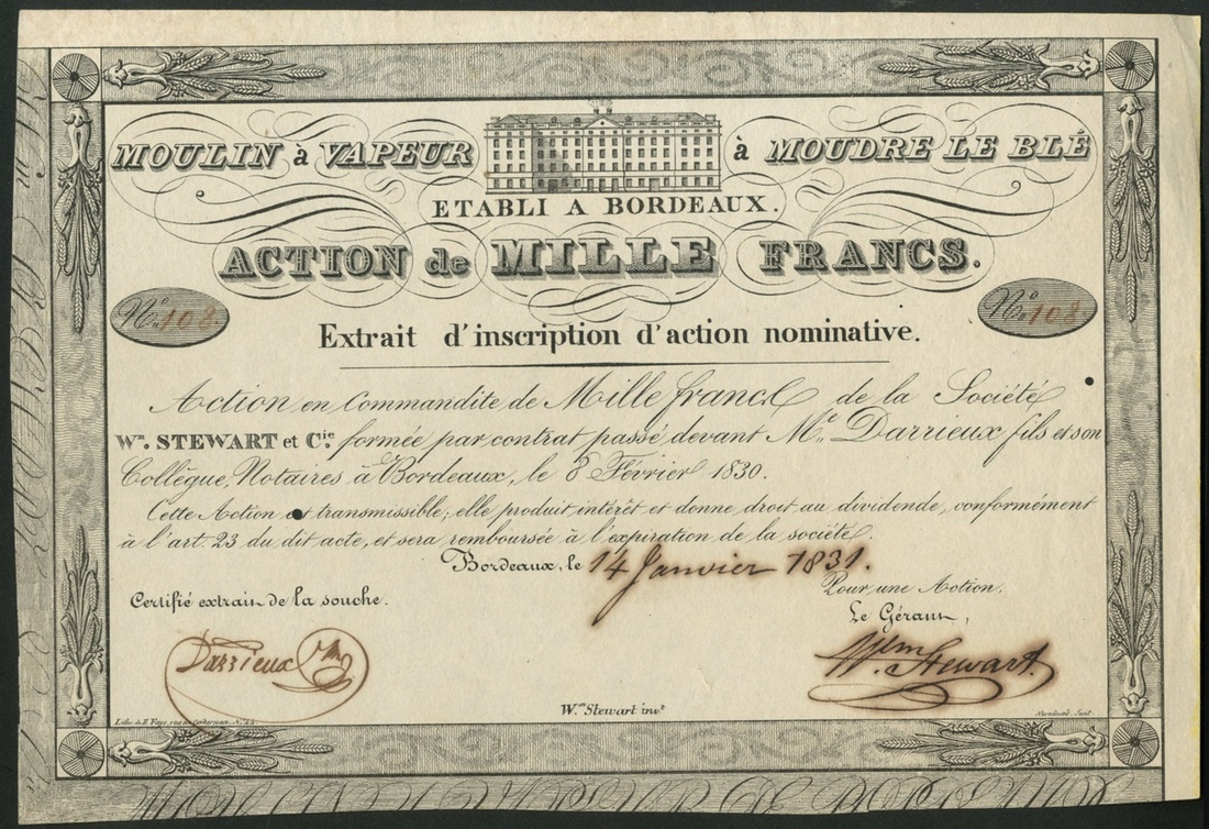 France: Moulin a Vapeur a Moudre le Blé (Wm Stewart et Cie), 1000 franc share, Bordeaux [1831], #108, small but attractive piece with vignette of building, possibly the very grand steam mill, black. William Stewart was admitted to the Institute of Civil Engineers in 1834. EF and rare.