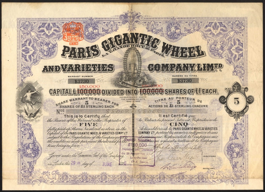 France: Paris Gigantic Wheel and Varieties Co. Ltd., 5 shares of £1, 189[8], #B3730, vignette of Ferris wheel at top, mauve and black, with coupons, stamped endorsement in centre, capital overprinted in red. Built for the Paris Exposition of 1900 and was slightly larger than the London Great wheel at 300 feet diameter built in 1895 at Earl's Court. It also held 1600 passengers. The wheel was dismantled in 1920 and the carriages used for the homeless. VF.